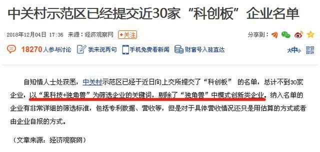 2018年12月,中关村示范区已经向上交所提交了科创板名单,以“黑科技+独角兽”为筛选企业的关键词,剔除了“独角兽”中模式创新类企业。