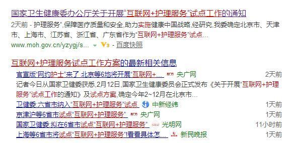 就在2019年2月12日,国家卫生健康委员会发布了大料《互联网+护理服务试点工作方案》,要在北京、天津、上海、江苏、浙江、广东六省进行试点。