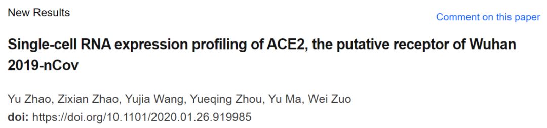 近日, 同济大学附属东方医院的 左为团队在 bioRxiv 上在线发表了一篇题为:Single-cell RNA expression profiling of ACE2,the putative receptor of Wuhan 2019-nCoV 的论文。